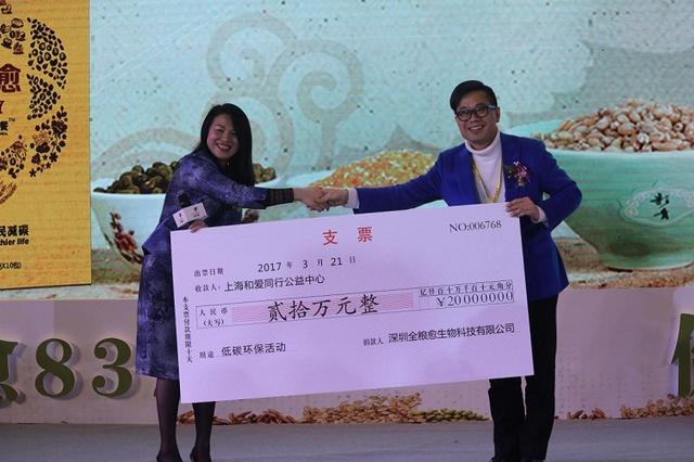 3月21日,中国上海,全粮愈8327新品发布会暨“健康生活全民减碳”公益启航仪式隆重举行。来自全球近五百名健康产业领域企业家汇聚一堂, 共同见证了中国领袖级素食全营养餐产品的新装亮相。他们更在公益倡议及铮铮誓言中组建企业家志愿者团队,承诺将低碳环保的生活追求作为自己的人生目标。 深圳全粮愈生物科技有限公司向上海和爱同行公益中心现场捐赠了20万元环保公益善款,这些款项将用于中国环保公益项目。